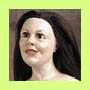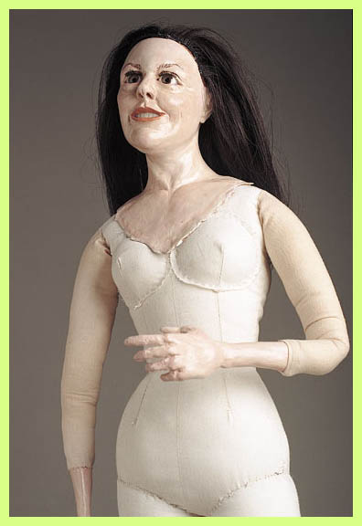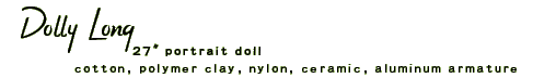 The body pattern was developed in the style of the late cloth doll artist Bob McKinley, using muslin draped over a cardboard armature. The style was chosen because of its distinctive pattern of seams on the body. The head, hands, and legs are sculpted from polymer clay over aluminum and/or paper mache cores. The eyes are ceramic. The wig and eyelashes are from Hollywood Toy & Costume. |