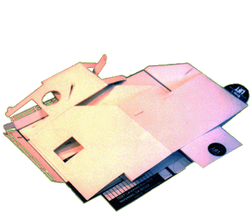 | It has long been a tradition when I move into a new apartment to draw a floorplan of the place so that friends and family can get some idea of my new surroundings. When I moved into the place where I live now, it was the first time I'd ever lived in a two-story apartment, and an ordinary floorplan seemed inadequate. I thought a 3D representation of some kind would be better, but it quickly became clear that in order to be enjoyable it would have to be easy to assemble: a pop-up. So I devised this card which unfolds in just seven simple steps to become a scale model of my entire apartment. |