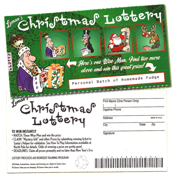 Inspired by some prop lottery tickets I made for a film, it occured to me to make custom lottery tickets as stocking stuffers for the family Christmas celebration. Gold chromatek rub-down patches were made to cover the four boxed icons and the prize, so each ticket could be rubbed off just like a real lottery ticket. Not all tickets were winners, but everyone in the family got two or three so they had a chance to win something. Part of the fun was the elaborate prizes you couldn't win, as well as the simple ones you could. Tickets were distributed at random by elves on Christmas Eve....