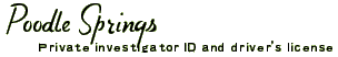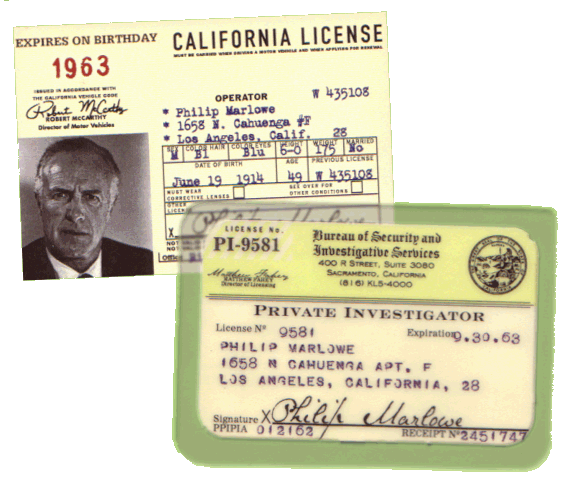 | <-- These prop ID cards were made for the HBO original movie Poodle Springs, starring James Caan as Philip Marlowe. The drivers license is a replica of the actual style of 1963, but research turned up no example of a vintage private investigator license, so that design was created from scratch. | |||