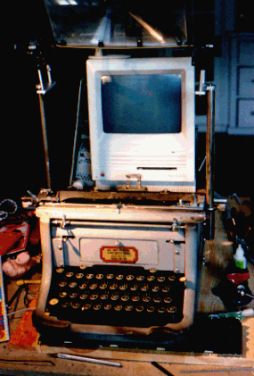 <-- Seen here at an early stage of construction, the MacSE is still inside its original casing. The computer's keyboard is hidden beneath the typewriter keyboard, and the keys are connected to each other with plastic rods.
