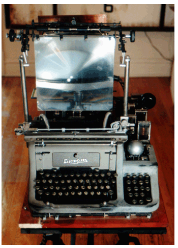 | <-- Nearly finished, the casing is painted and a logo added to the front. The Macintosh CRT is mounted in a custom-fitted bracket behind a swing-away fresnel lens, which hangs from what was the platen of the original typewriter. A bank of relays lines the right side, and radio tubes stand in front of the screen. The speaker has been installed in a WWII Army surplus microphone housing, projecting from the right side of the machine. |