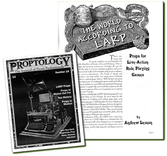 The ElectriClerk was featured on the cover of Issue 18 of Proptology magazine, the journal of prop professionals, published occasionally in Canada. Photos of the prop accompanied pictures of some of the other props on this site, and an article I wrote about the use of props in Live-Action Roleplaying games (LARPs).