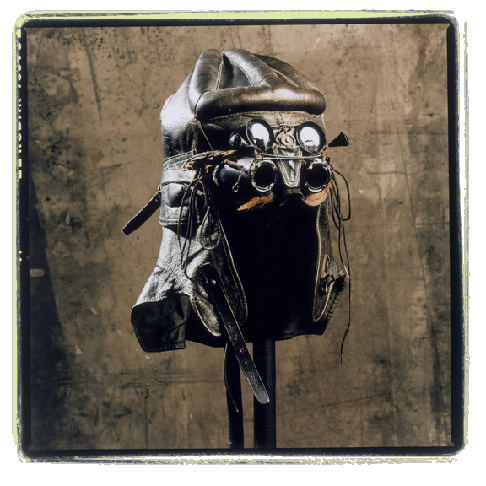 | This leather aviation helmet was wired with a pair of concealed headphones which connected to a portable cassette player. When the helmet is securely fastened and the blinders of the goggles are down, the wearer cannot see anything and can only hear what is coming through the headphones.