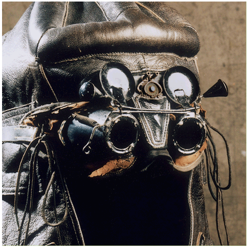 Between the eyes of the spectacles is a leather pouch holding a silver pendant which itself contains an eye. The pendant, purchased at a New York City magick shop, was also used as a prop in the game. By combining the pendant, the helmet, and the strange spectacles, the characters in the game were able to have a "transdimensional" experience. |