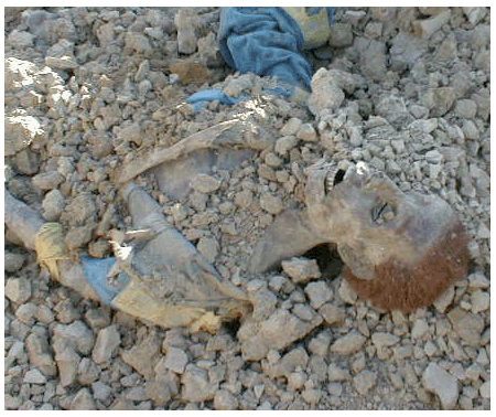 | <-- The head was originally attached to an entire mummified body, seen here, which was discovered during the game in the middle of the Mojave desert. A friend of mine just happened to have a decapitated prop corpse, which I used as the basis for the mummy. After the game, I returned the rest of the body and kept the head. |