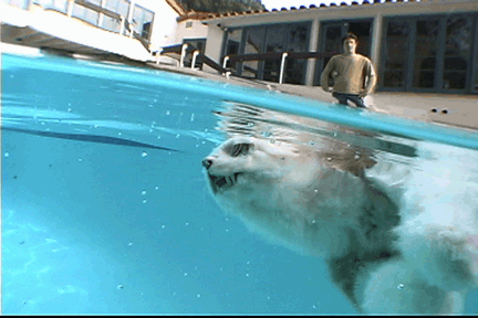 Click the image at left to see a video clip of the cat floating in the pool (1MB download). |